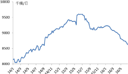本轮油价暴跌中,美国油井钻机数急速滑坡,从2015年年初的1482台,下降至2016年5月底的316台,降幅78.68%。随着油价上升,从6月开始,钻机数开始小幅回升,从316台上升到7月1日当周的341台。钻机数量下滑,使页岩油井的高递减率无法像过去几年一样被弥补,导致美国原油产量增长停滞,从去年6月触及961万桶/日的周均产量顶点逐渐回落至862.2万桶/日,相距高点回落10.3%,产能出清效果初显。(图2)