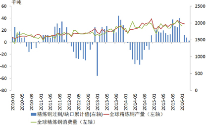 目前能源价格较低,矿产国对美汇率大幅贬值,生产成本也随之下滑,铜价与铜现金成本仍存在一定的空间,铜矿产能略有增加,产能利用率略有下滑,但保持在高位。冶炼费用年初有所下滑,但仍然较高,使冶炼企业产能利用率保持上升。由于铜矿生产保持较高增速,由于冶炼企业近年来一直处于比较强势的谈判地位,较高的冶炼费用使得部分冶炼企业的减产很快被其他企业增产所替代。根据ICSG统计,2016年前3个月全球铜矿产能增速为5.0%,全球精炼铜产能较去年同期增长1.7%,略有下滑。