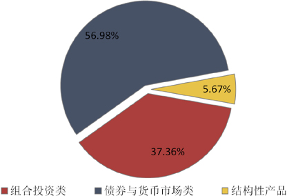 从投向类型来看,债券与货币市场类产品发行了4435款,环比增加317款,市场占比上升2.55个百分点至56.98%;组合投资类产品发行了2908款,环比减少81款,市场占比下降2.15个百分点至37.36%;结构性产品发行了441款,环比减少18款,市场占比下降0.40个百分点至5.67%。(图4)