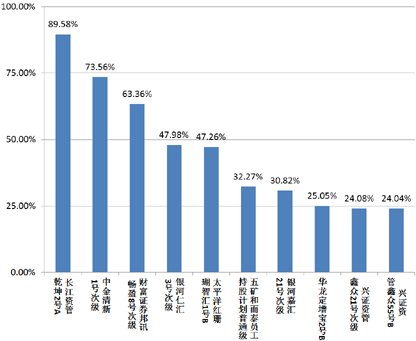 从资金运用领域看,房地产领域产品发行了71款,占比为30.08%,环比上升1.08个百分点;工商企业领域产品发行了50款,占比为21.19%,环比下降1.31个百分点;金融领域产品发行了46款,占比为19.49%,环比下降1.51个百分点;基础设施领域产品发行了46款,占比为19.49%,环比上升1.99个百分点;证券投资领域产品发行了10款,占比为4.24%,环比上升2.24个百分点;其他领域产品发行了13款,占比为5.51%,环比下降2.49个百分点。证券投资领域产品发行继续上扬,考虑到许多私募机构仓位都创自2015年股灾来的新高,不排除该类产品发行数量进一步上涨的可能性。