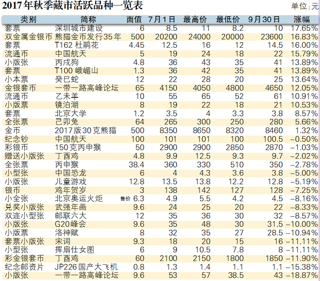 截止到9月底,第三季度发行的“香港回归20年”、“凤文物”、“外国音乐家(2)”、“创新科技”、“建军90周年”和“张謇”套票分别下跌到2.2元、4.3元、2.8元、3.5元、5.2元和1.5元,均已跌破面值,且折扣率分别在30%以上。而“喜鹊”小版张和套票分别在11元和1.3元,“建军90周年”和“张謇”小版张分别在14.8元和9.5元盘旋,“金砖国家领导人厦门会晤”小版张和套票分别维持在21元和1.4元,“第13届全运会”小全张、“建军90年”和“张謇”小型张分别下滑至2.3元、6.3元和4元。