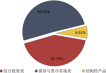 从投向类型来看,债券与货币市场类产品发行了4955款,环比减少14款,市场占比上升0.56个百分点至50.65%;组合投资类产品发行了4181款,环比减少178款,市场占比下降1.20个百分点至42.74%;结构性产品发行了647款,环比增加55款,市场占比上升0.65个百分点至6.61%。(图4)