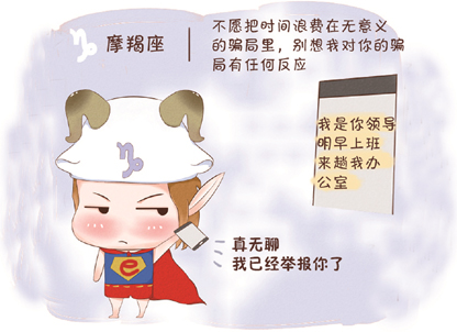不苟言笑的摩羯座,永远不会浪费时间与骗子周旋。接到冒充领导的诈骗电话,一定会第一时间举报。该出手时就出手,绝不手软。