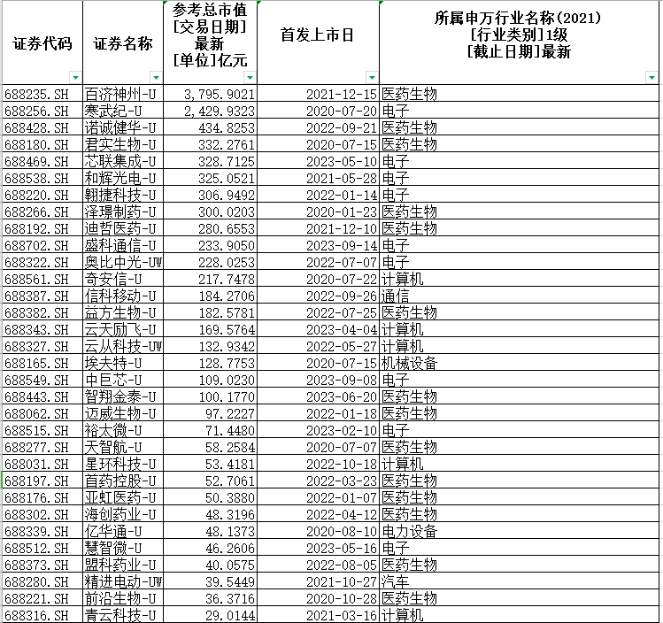 具体来看,32家尚未摘“U”的存量公司包括:泽璟制药、君实生物、前沿生物、青云科技、和辉光电、精进电动、百济神州、迪哲医药、迈威生物、翱捷科技、亚虹医药、首药控股、海创药业、云从科技、益方生物、奥比中光、盟科药业、诺诚健华、信科移动、星环科技、裕太微、云天励飞、天智航、奇安信、寒武纪、亿华通、埃夫特、慧智微、芯联集成、智翔金泰、盛科通信、中巨芯。