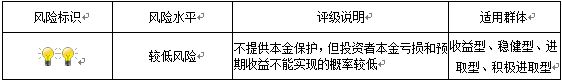 本期产品为非保本浮动收益型理财产品,不保证本金和收益,请您充分认识投资风险,谨慎投资。本期产品期限90天(中国建设银行有权对本期产品进行展期和提前终止),存续期内产品不接受申购或赎回申请。本期产品内部风险评级级别为2盏警示灯 ,风险程度属于较低风险。最不利情况下,资产组合无法回收任何本金和净收益,客户将损失全部本金。产品适合于收益型、稳健型、进取型、积极进取型客户。
