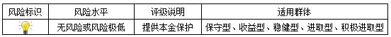 本期产品为保本浮动收益型理财产品,本理财产品有投资风险,只保障理财资金本金,不保证理财收益,您应当充分认识投资风险,谨慎投资。本期产品期限为93天(中国建设银行有权对产品进行展期或提前终止)。本期产品内部风险评级级别为一盏警示灯,风险程度属于无风险或风险极低,适用于保守型、收益型、稳健型、进取型及积极进取型投资者。最不利情况下,客户只能收回投资本金,不能获得任何投资收益。