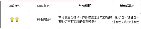 本期产品为非保本浮动收益型理财产品,不保证本金和收益,请您充分认识投资风险,谨慎投资。本期产品期限261天(中国建设银行有权对本期产品进行展期和提前终止),存续期内产品不接受申购或赎回申请。本期产品内部风险评级级别为2盏警示灯 ,风险程度属于较低风险。最不利情况下,资产组合无法回收任何本金和净收益,客户将损失全部本金。产品适合于收益型、稳健型、进取型、积极进取型客户。