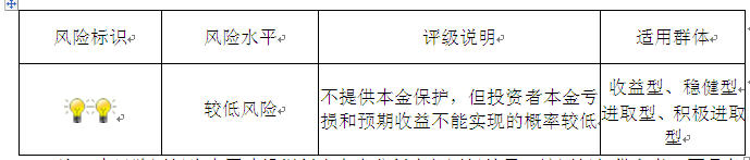 本期产品为非保本浮动收益型理财产品,不保证本金和收益,请您充分认识投资风险,谨慎投资。本期产品期限195天(中国建设银行有权对本期产品进行展期和提前终止),存续期内产品不接受申购或赎回申请。本期产品内部风险评级级别为2盏警示灯 ,风险程度属于较低风险。最不利情况下,资产组合无法回收任何本金和净收益,客户将损失全部本金。产品适合于收益型、稳健型、进取型、积极进取型客户。