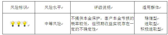 本期产品为非保本浮动收益型理财产品,不保证本金和收益,请您充分认识投资风险,谨慎投资。本期产品期限181天(中国建设银行有权对本期产品进行展期和提前终止),存续期内产品不接受申购或赎回申请。本期产品内部风险评级级别为3盏警示灯 ,风险程度属于中等风险。最不利情况下,资产组合无法回收任何本金和净收益,客户将损失全部本金。产品适合于稳健型、进取型及积极进取型客户。