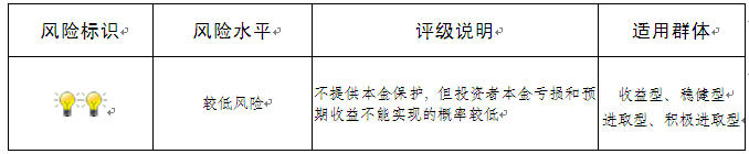 本期产品为非保本浮动收益型理财产品,不保证本金和收益,请您充分认识投资风险,谨慎投资。本期产品期限112天(中国建设银行有权对本期产品进行展期和提前终止),存续期内产品不接受申购或赎回申请。本期产品内部风险评级级别为2盏警示灯 ,风险程度属于较低风险。最不利情况下,资产组合无法回收任何本金和净收益,客户将损失全部本金。产品适合于收益型、稳健型、进取型、积极进取型客户。