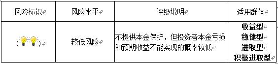 本期产品为非保本浮动收益型理财产品,不保证本金和收益,请您充分认识投资风险,谨慎投资。本期产品期限109天(中国建设银行有权对本期产品进行展期和提前终止),存续期内产品不接受申购或赎回申请。本期产品内部风险评级级别为2盏警示灯 ,风险程度属于较低风险。最不利情况下,资产组合无法回收任何本金和净收益,客户将损失全部本金。产品适合于收益型、稳健型、进取型、积极进取型客户。