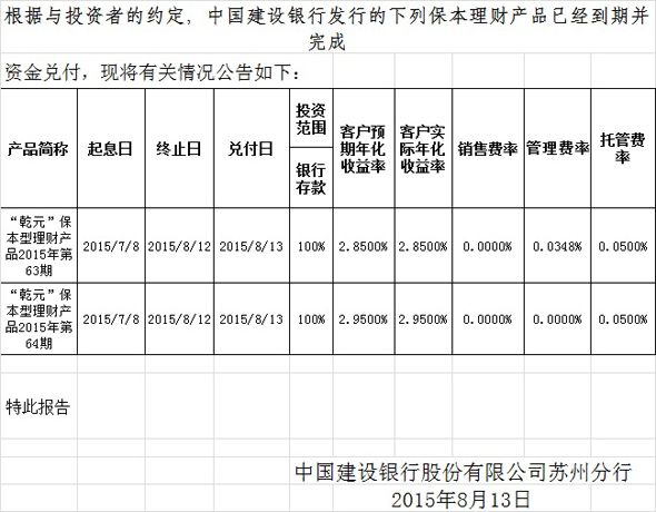 中国建设银行苏州分行保本理财产品2015年第63期64期理财产品兑付公告