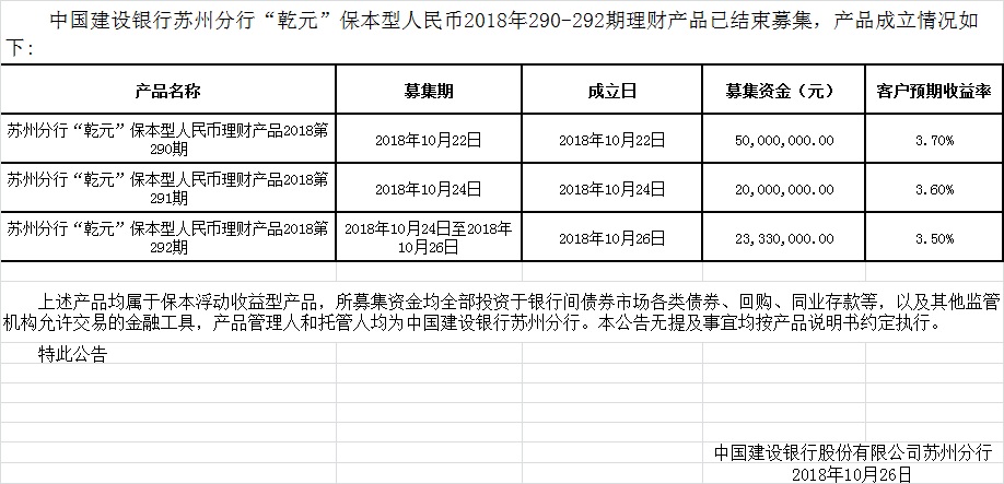 中国建设银行苏州分行“乾元”保本型人民币2018年290-292期理财产品成立公告