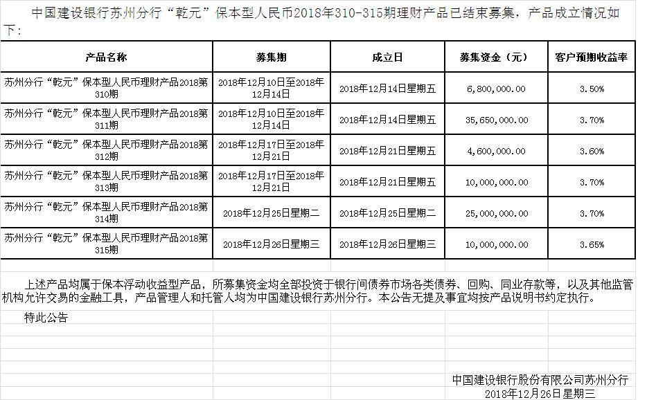 中国建设银行苏州分行“乾元”保本型人民币2018年310-315期理财产品成立公告
