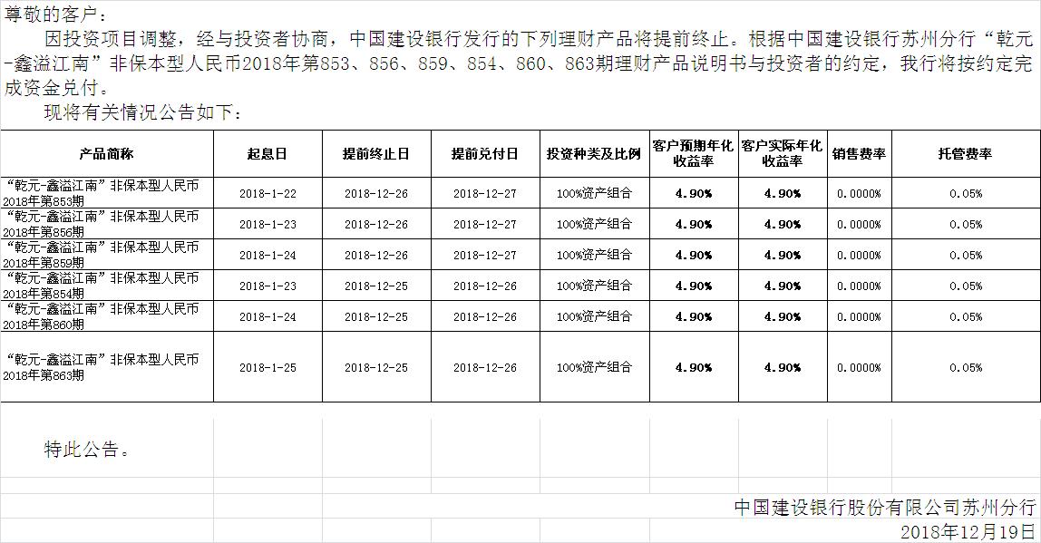 中国建设银行苏州分行“乾元-鑫溢江南”非保本型人民币2018年第853、856、859、854、860、863期理财产品提前兑付公告