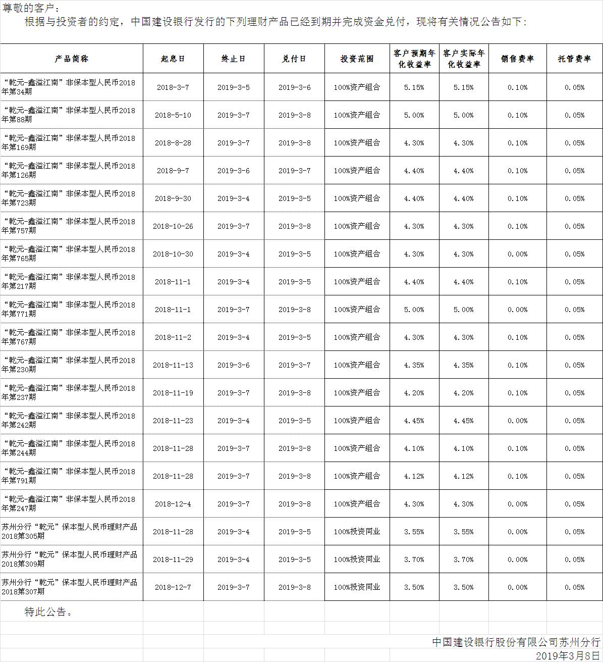 中国建设银行理财产品终止及清算公告