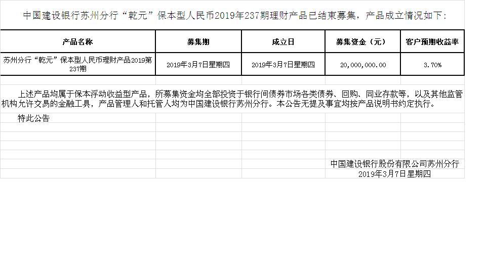 中国建设银行苏州分行“乾元”保本型人民币2019年237期理财产品成立公告