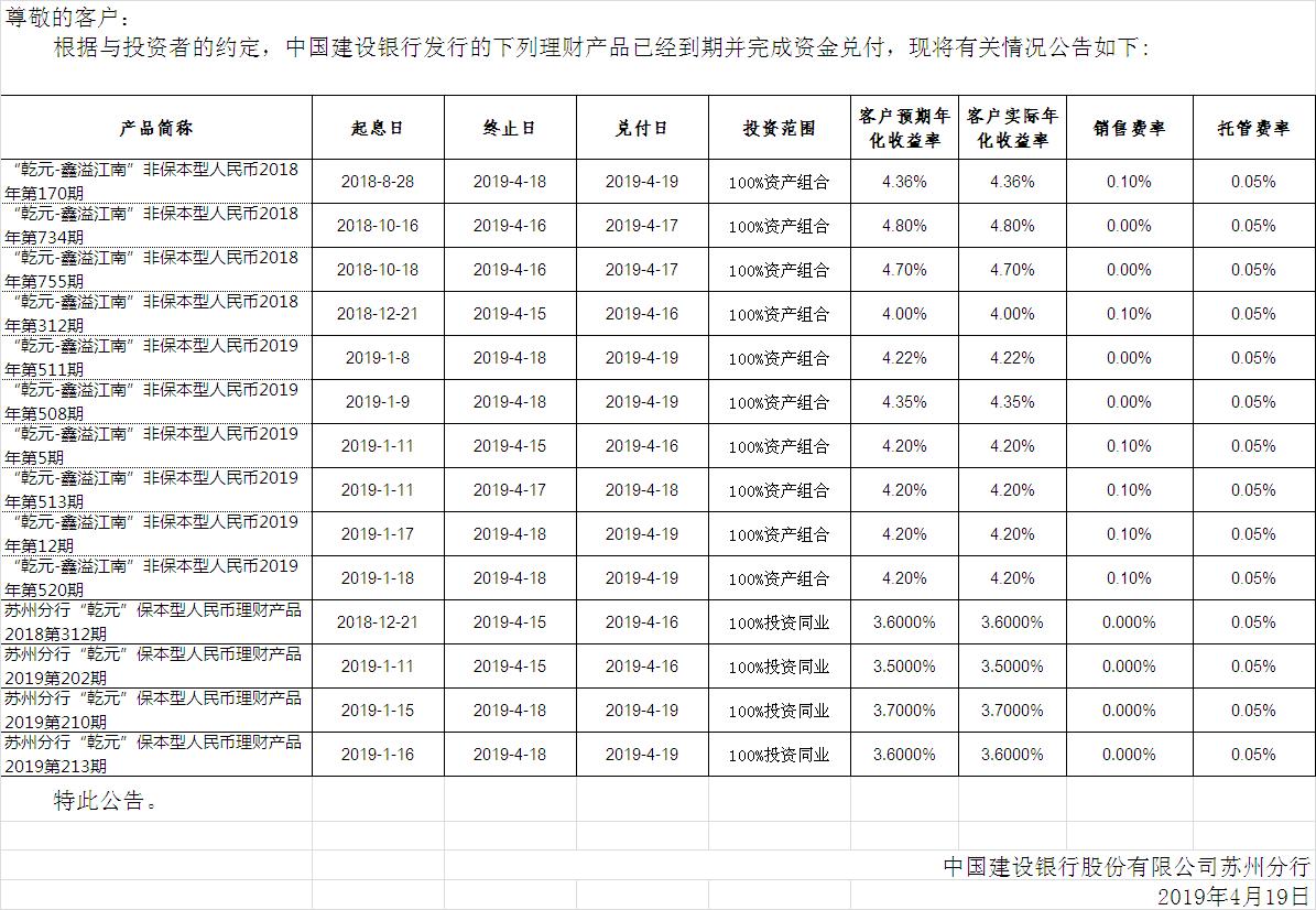 中国建设银行理财产品终止及清算公告