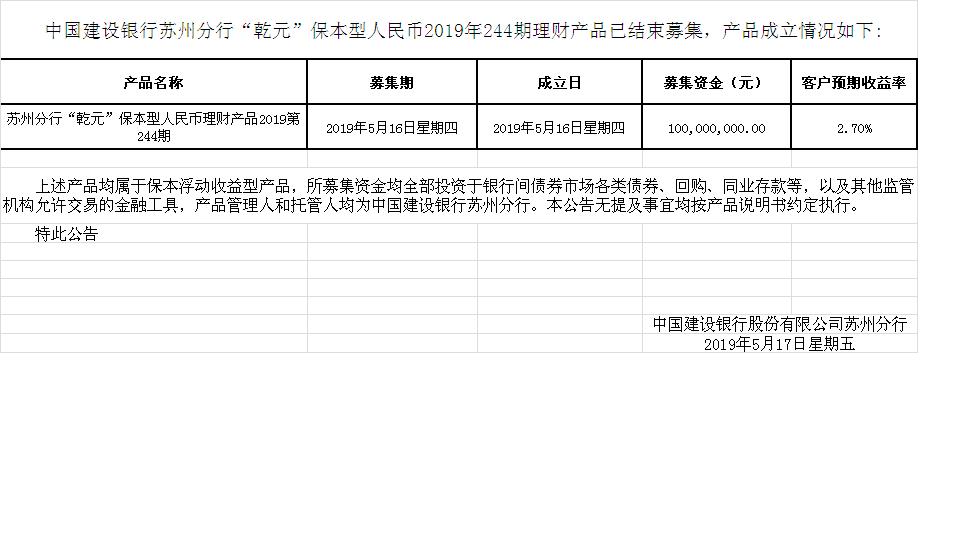 中国建设银行苏州分行“乾元”保本型人民币2019年244期理财产品成立公告