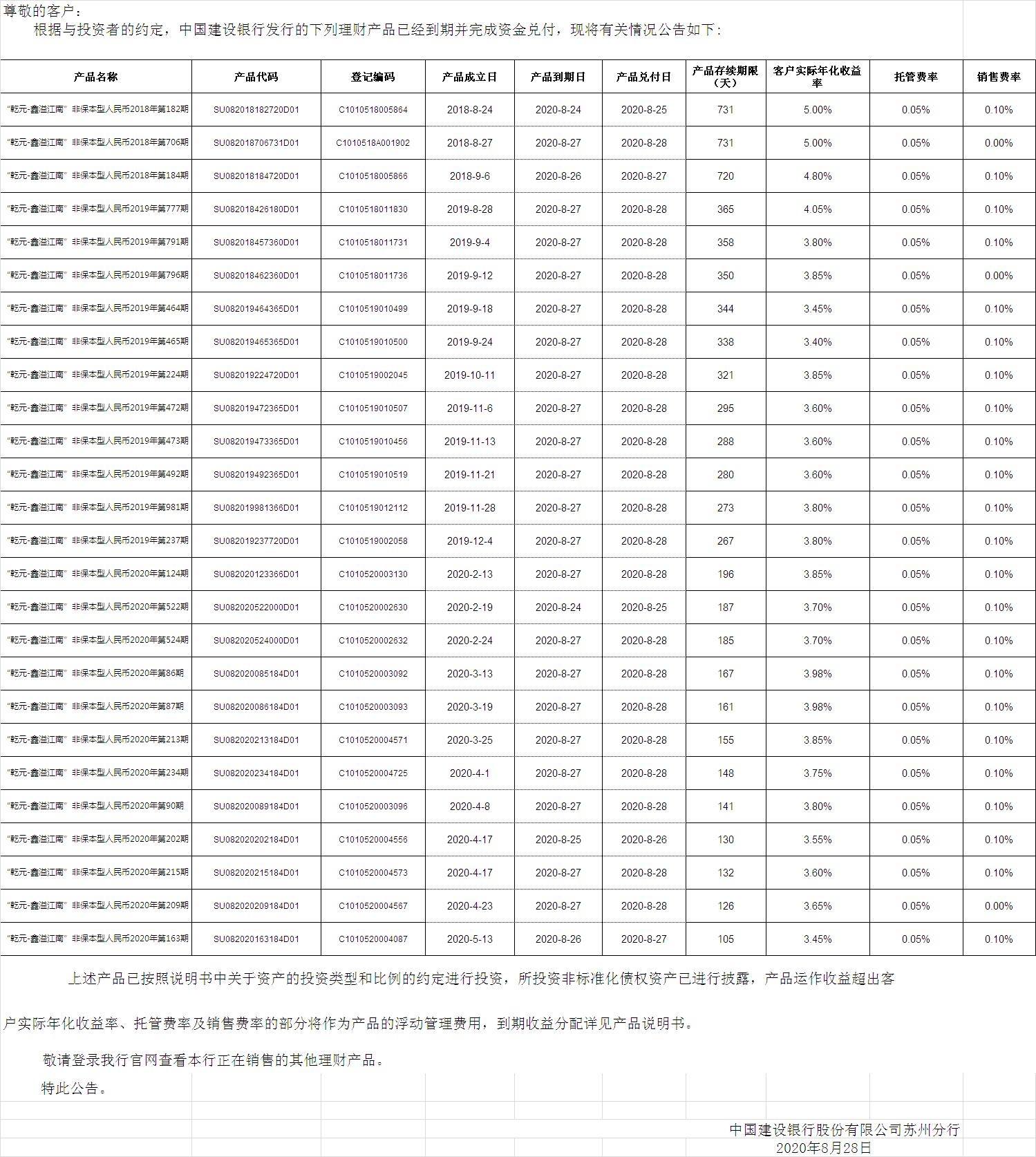 中国建设银行理财产品终止及清算公告