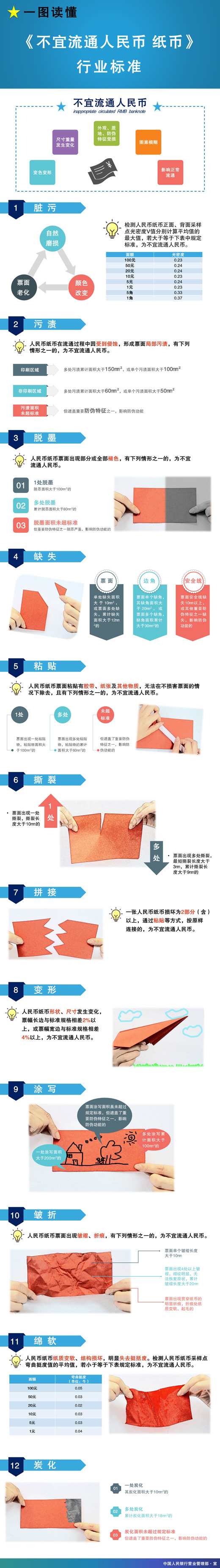 2017年5月25日,中国人民银行发布了《不宜流通人民币 纸币》行业标准,规定了不宜流通人民币纸币的类别及判定指标。按照规定,银行应免费为公众兑换不宜流通人民币纸币,不得付出不宜流通人民币纸币。什么样的人民币纸币属于不宜流通人民币呢?带您一图读懂。