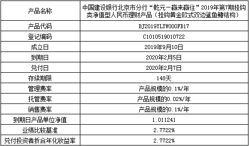 中国建设银行北京市分行“乾元—赢来赢往”2019年第7期挂钩类净值型人民币理财产品(挂钩黄金欧式双边鲨鱼鳍结构)终止及清算公告