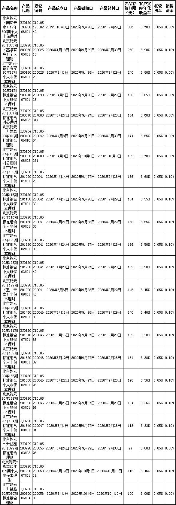 中国建设银行理财产品终止及清算公告2020年10月12日