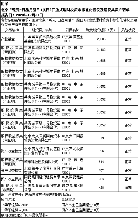 (2)本产品投资的债券18华阳经贸SCP002、18华阳经贸SCP003,金额各2亿元,未能按期足额兑付本息,已构成违约。本产品投资的债券18中信国安MTN001、15中信国安MTN004,金额各0.5亿元,未能按期足额兑付利息,已构成违约。上述资产在本产品组合资产中占比较小,本产品整体运作正常。