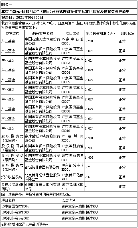 (2)本产品投资的债券18华阳经贸SCP002、18华阳经贸SCP003,金额各2亿元,未能按期足额兑付本息,已构成违约。本产品投资的债券18中信国安MTN001、15中信国安MTN004,金额各0.5亿元,未能按期足额兑付本息,已构成违约。上述资产在本产品组合资产中占比较小,本产品整体运作正常。