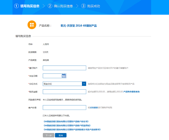 填写建行账号、购买金额等信息,抄录风险提示声明,阅读并同意相关协议内容。