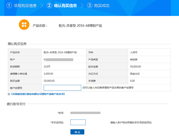 对产品信息、账号、购买金额等信息进行确认,输入账号预留的手机号后四位并校验短信验证码,点击“确定”提交。