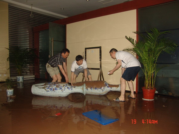 7月19日凌晨4点,四川达州分行行领导和员工在进水的营业部大厅清淤、整理。他们通宵达旦坚守一线,近20个小时未合眼,力争做好抢险救灾工作,降低损失,力争最快恢复营业。