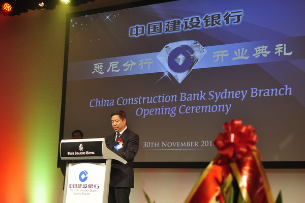 2010年11月30日,中国建设银行悉尼分行在澳大利亚悉尼举行隆重开业仪式。中国建设银行监事长张福荣先生、业务总监杜亚军先生、中国驻澳大利亚大使陈育明先生、中国驻悉尼总领事胡山先生、澳大利亚审慎监管局董事伊恩·洛夫林先生以及来自澳大利亚社会各界嘉宾400余人应邀出席了开业仪式。悉尼分行是自2008年全球金融海啸以来第一家在澳获得经营资格的中资银行,也是建行在大洋洲设立的第一家分行。悉尼分行的设立不仅标志着建行的海外机构网络已覆盖了全球各主要金融中心,也标志着建行的海外发展战略又向前推进了重要一步。