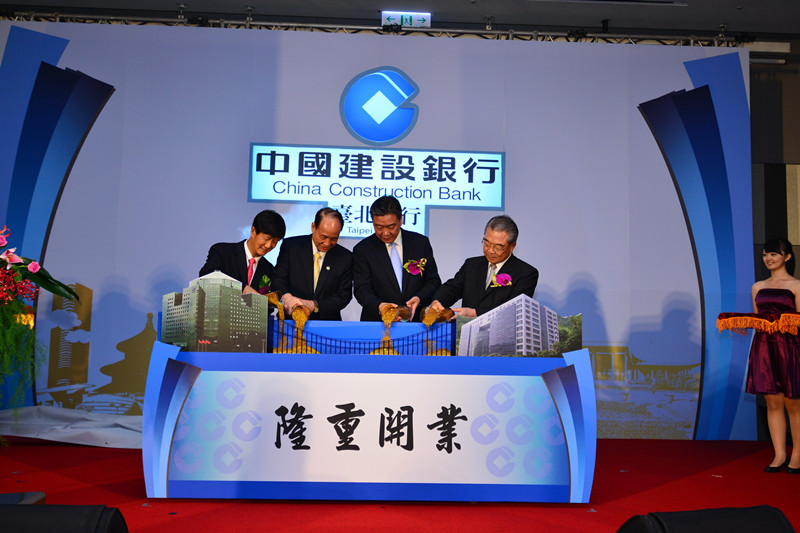 中国建设银行行长张建国、副行长胡哲一、海峡交流基金会董事长林中森、仁宝集团董事长许胜雄共同庆祝台北分行开业
