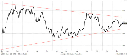 2012年铜价整体呈现三角形盘整的走势。LME、COMEX、上海期交所三家交易所铜价走势基本一致。以伦敦期货交易所三月期铜(以下简称伦铜)为例,2012年开于7645美元/吨,收报7931美元/吨,全年涨3.74%,2010年涨幅29.64%,2011年跌幅为22.53%。年内高点为8765美元/吨,年内低点为7219.5美元/吨,年度波动率为21.4%,为近三年来最小波动幅度。(图1)