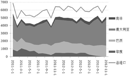 根据中国海关总署的统计,2012年,我国铁矿石的主要进口来源为澳大利亚、巴西、印度和南非。每月进口量维持在6000万吨左右,相比去年更为稳定。截止11月底,我国铁矿石进口总量为67454万吨,同比增长5178万吨或8.21%,全年进口总量预计将接近7.5亿吨。从铁矿石进口来源地看,我国对澳大利亚和巴西的铁矿石依赖程度加深,从印度的进口量降幅较大。(图6)