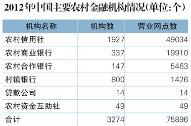 第三,村镇银行等新型农村金融机构快速组建。截至2012年末,全国共组建村镇银行876家,比2011年末增加150家,其中开业800家,筹建76家。