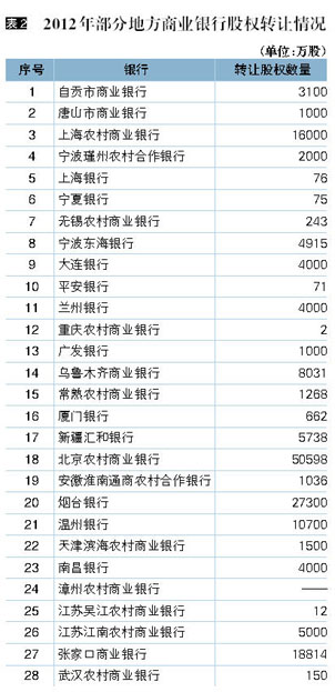 地方商业银行关注的首要问题是改革上市,但无一家商业银行IPO成功。目前,在证监会排队等待上市的八百余家企业中,有包括城市商业银行和农村商业银行在内的16家地方商业银行,其中,成都银行和无锡农村商业银行为2012年新增(见表1)。因此,地方商业银行股权交易变得异常活跃,从地方商业银行的角度来说,是由于其股权结构比较复杂,成为上市的一大瓶颈。在筹划上市过程中,为满足上市条件,股权交易就成为地方商业银行清理股权、扫除上市障碍的重要途径。而从股东角度来说,从2012年1季度开始,部分城市商业银行和农村商业银行不良贷款余额上升较快,一部分股东出于对资产质量担忧而采取减持措施;另外,在经济和投资增速下滑的情况下,部分持有地方商业银行股份的企业(主要是受经济下滑影响较大的民营企业)现金流出现困难,被迫减持所持有的银行股份。据不完全统计,涉及股权转让的地方商业银行数量约28家(见表2),大大超出2011年的17家和2010年的6家。与此同时,2012年地方商业银行股权转让具有一个突出特点,即前十大股东出现在转让方中频率较高,其中不乏地方财政股东,明显不同于2011年的主要为内部员工持股股权转让。如,2012年上半年,张家口市财政局转让其持有的张家口商业银行1.88亿股股份,合18.81%的股权;北京农村商业银行第三大股东北京华融综合投资公司转让其持有的北京农村商业银行5亿股股份,合5.23%的股权;新疆汇和银行第一大股东奎屯市财政局转让3898.27万股股份,合13.44%的股权;天津滨海农村商业银行第一大股东华融资产管理公司,转让其7.09%的股权;烟台银行第二大股东华电集团转让其持有的烟台银行全部股份,合13.65%的股权;2012年9月,宁波东海银行的大股东新疆联和投资向巨星科技转让其持有的4915.65万股股份,占宁波东海银行总股本的9.657%。