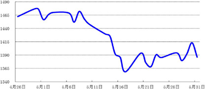 上周,国际金价呈震荡走势,先是突破1400美元/盎司,之后在美国5月芝加哥PMI指数和密歇根大学消费者信心指数远超预期影响下,再次跌破1400美元/盎司,全周仅微涨0.85美元/盎司至1386.40美元/盎司;布伦特原油下跌2.25美元/桶至100.39美元/桶。