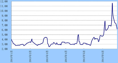货币市场:上周,央行公开市场未进行任何操作,仅央票到期向市场净投放250亿元,资金面紧张局面有所缓和,货币市场利率高位回落,7天质押式回购利率较6月21日下行309基点至6.16%。