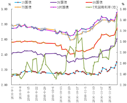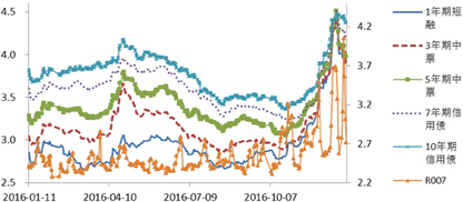 进入四季度后,由于央行公开市场投放量价持续谨慎,且传出央行将表外理财纳入广义信贷的消息,市场去杠杆预期逐渐得到足够强化,债市观望气氛浓厚,收益率反弹动能积聚。此外,四季度CPI和PPI改善以及海外通胀预期的上升也令债市承压。最终,在11月末市场资金面持续偏紧,市场预期极为谨慎的情况下,传出大行收紧融出并赎回委外产品消息,激发债市恐慌情绪,年末收益率大幅上行。随后,美联储加息次数可能超出预期以及国海证券公告其前员工私刻公章事件,均进一步打击本已脆弱的市场情绪,令收益率大幅反弹。(图1、图2)
