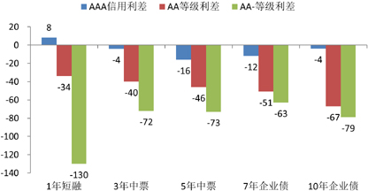 图4 2016年AAA级信用利差、AA等级利差、AA-等级利差较2015年底变动