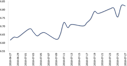 上周,美元指数V型反转。周三,因欧美贸易摩擦初步达成协议,欧元反弹,美元指数急跌0.4%;周四,欧洲央行公布利率决议,将维持低利率水平至明年夏天,欧元创下逾一个月来最大单日跌幅,美元指数顺势反弹,周五收于94.69,当周累计上涨0.23%。受国常会释放货币政策边际宽松信号影响,离岸人民币大幅下挫,在岸人民币跟随下行,盘中最低触及6.8390,创2017年6月27日以来新低,周五收于6.8246,当周累计下跌0.66%,预计人民币短期仍有调整压力。