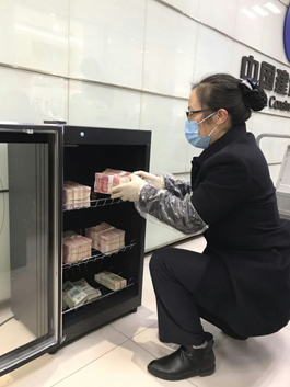 浙江省杭州高新支行对收付现金进行消毒,确保客户用上“放心钱”。■ 陈薇/摄