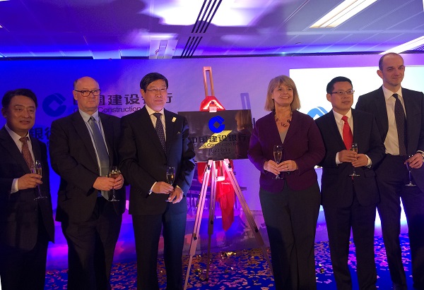 伦敦当地时间2015年10月19日,中国国家主席习近平对英国进行国事访问当日,中国建设银行伦敦分行隆重举行开业暨新办公楼启用典礼。中国建设银行董事长王洪章、英国财政部经济部长哈瑞特-鲍德温、中国人民银行欧洲代表处首席代表包明友、汇丰银行集团主席范智廉以及来自英国社会各界嘉宾共300余人出席了庆祝活动。同日,中国建设银行还在伦敦举办了中国银行间市场投资研讨会、“人民币国际化”图片展等系列活动, 并与英国贸易投资总署、芝加哥商品交易所、英国标准人寿公司等战略合作伙伴与客户举行了签约仪式。建设银行在离岸市场上发行的人民币债券也将于10月20日首次在伦敦证券交易所上市。