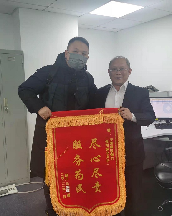 建行贵阳城北支行尽心为八旬老人找到20多年前的凭证,为表示感谢客户的儿子特地送上锦旗