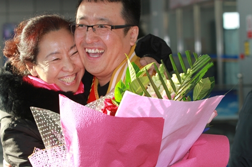 捐献完干细胞归来的张博和妈妈拥抱在一起