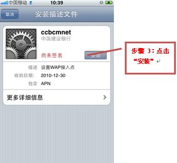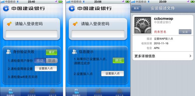 出于安全考虑,手机银行的金融交易是以客户手机号码作为身份验证的,由于运营商技术要求和iPhone本身技术特点必须通过描述文件修改iPhone接入点,才能从运营商处取到手机号。 目前国内三大运营商(移动、联通、电信)都有各自的NET接入点和WAP接入点,运营商规定只有通过WAP接入点才能获取手机号。 iPhone默认使用的是NET接入点无法通过设置更改,网络设置描述文件的作用就是添加一个WAP接入点到iPhone中。这可能引起一些使用其他连接方式的软件无法正常使用。如果想使用这些软件可临时卸载描述文件。描述文件的卸载方法为“设置->通用->描述文件->移除”。之后再次使用手机银行时需要重新安装描述文件。 1. WAP接入点设置 用户首次启动和获取手机号失败时,选择“设置接入点”,均可启动描述文件安装。
