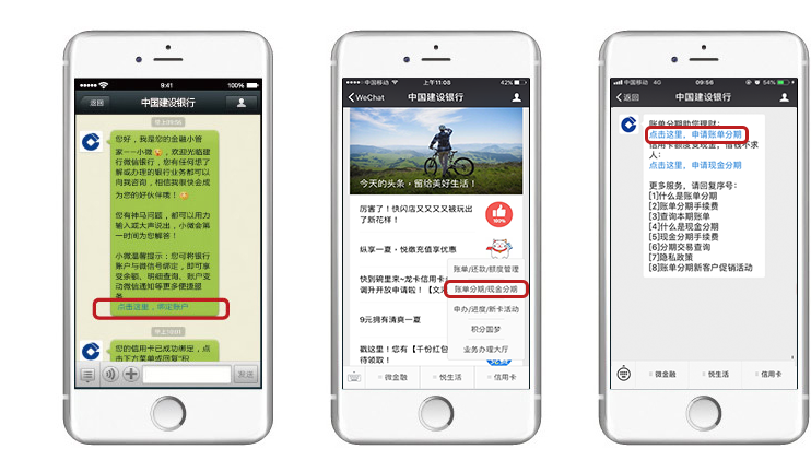 关注“中国建设银行”微信公众号,绑定信用卡,依次点击 信用卡