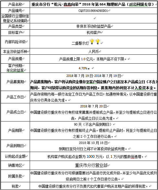 1.本期产品规模上限:1.0亿元。在本期产品募集期内,对本期产品的认购金额达到本期理财产品规模上限,则中国建设银行重庆市分行有权利但无义务停止本期产品的认购,已经认购成功的客户投资权益不受影响。